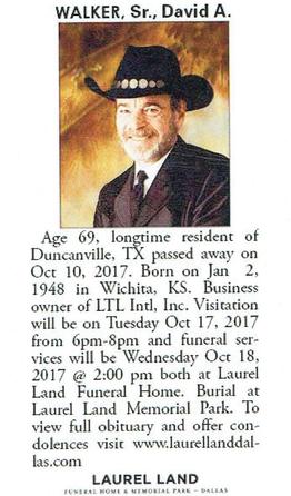 David A. Walker Sr. - Visitation is Tues, Oct. 17th between 6 to 8 pm. The funeral services will be on Wed, Oct. 18th at 2:00pm. Both will be at Laurel Land Memorial Park. It's just off I35. Here's the obit she sent.
